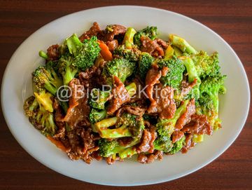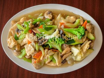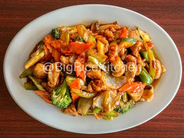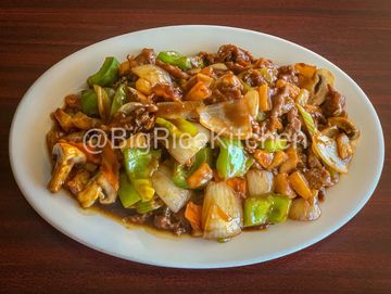 Stir fried beef with white onion, bell pepper, celery, carrot, and mushroom. Topped with garlic sauce.