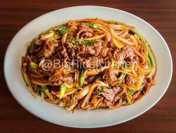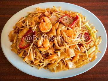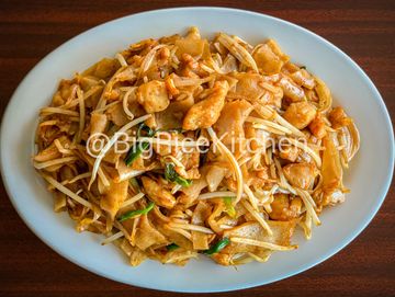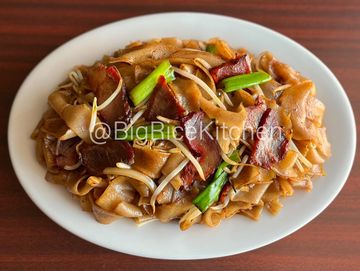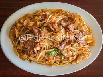 Thick, flat rice noodles stir-fried in brown sauce with beansprouts, green onions, and white onions.