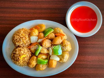 Served with 2 crab puffs, spring roll, and fried/white rice.