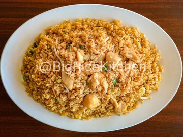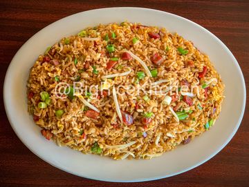 Best selling fried rice tossed with shrimp, chicken, BBQ pork, eggs, bean sprouts, and green onions. Arroz frito que viene con camarone, pollo, puerco BBQ, huevos, brotes de soja, y cebollas verdes.