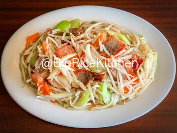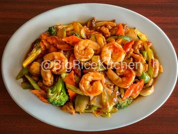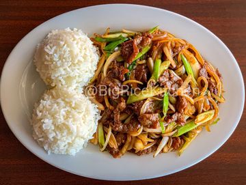 Stir-fry beansprouts with carrots and choice of meat. Served with crispy noodles or white rice.