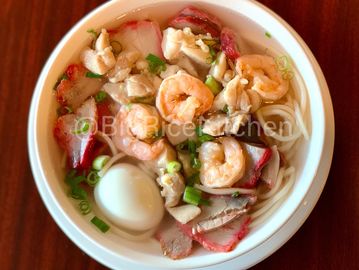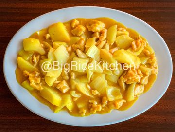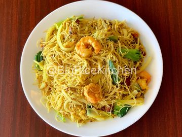 Rice noodles stir-fried with shrimp (5), BBQ pork, white onion, green onion, and bean sprouts, mixed with our homemade curry sauce.