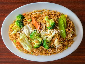Fried rice mixed with egg, bean sprouts, green onion, broccoli, cabbage, mushroom, zucchini, carrots, celery, and snow peas. Arroz frito que viene con huevos, brotes de soja, cebolla verde, brócoli, repollo, champiñones, calabacín, zanahorias, apio y guisantes.