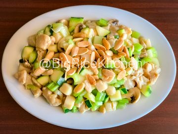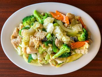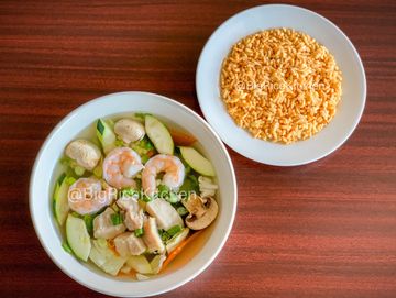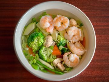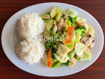 White meat chicken, shrimp (6), broccoli, cabbage, carrots, zucchini, mushroom, snow peas, celery