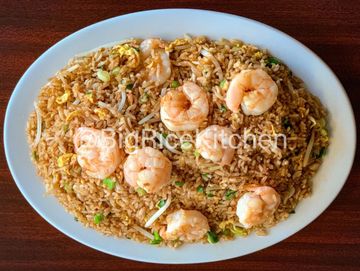 Fried rice mixed with shrimp, eggs, bean sprouts, and green onions. Arroz frito que viene con camarones, huevos, brotes de soja, y cebollas verdes.