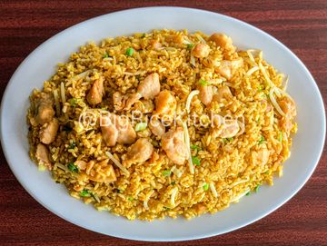 Fried rice mixed with chicken, eggs, bean sprouts, and green onions, tossed in our homemade curry sauce. Arroz frito mezclado con salsa de curry, viene con pollo, huevos, brotes de soja y cebollas verdes.