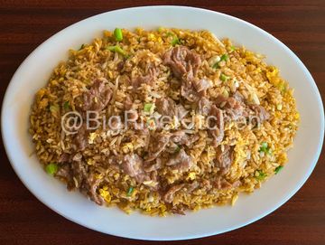 Fried rice that comes with beef, eggs, bean sprouts, and green onions. Arroz frito que viene con carne de res, huevos, brotes de soja, y cebollas verdes.